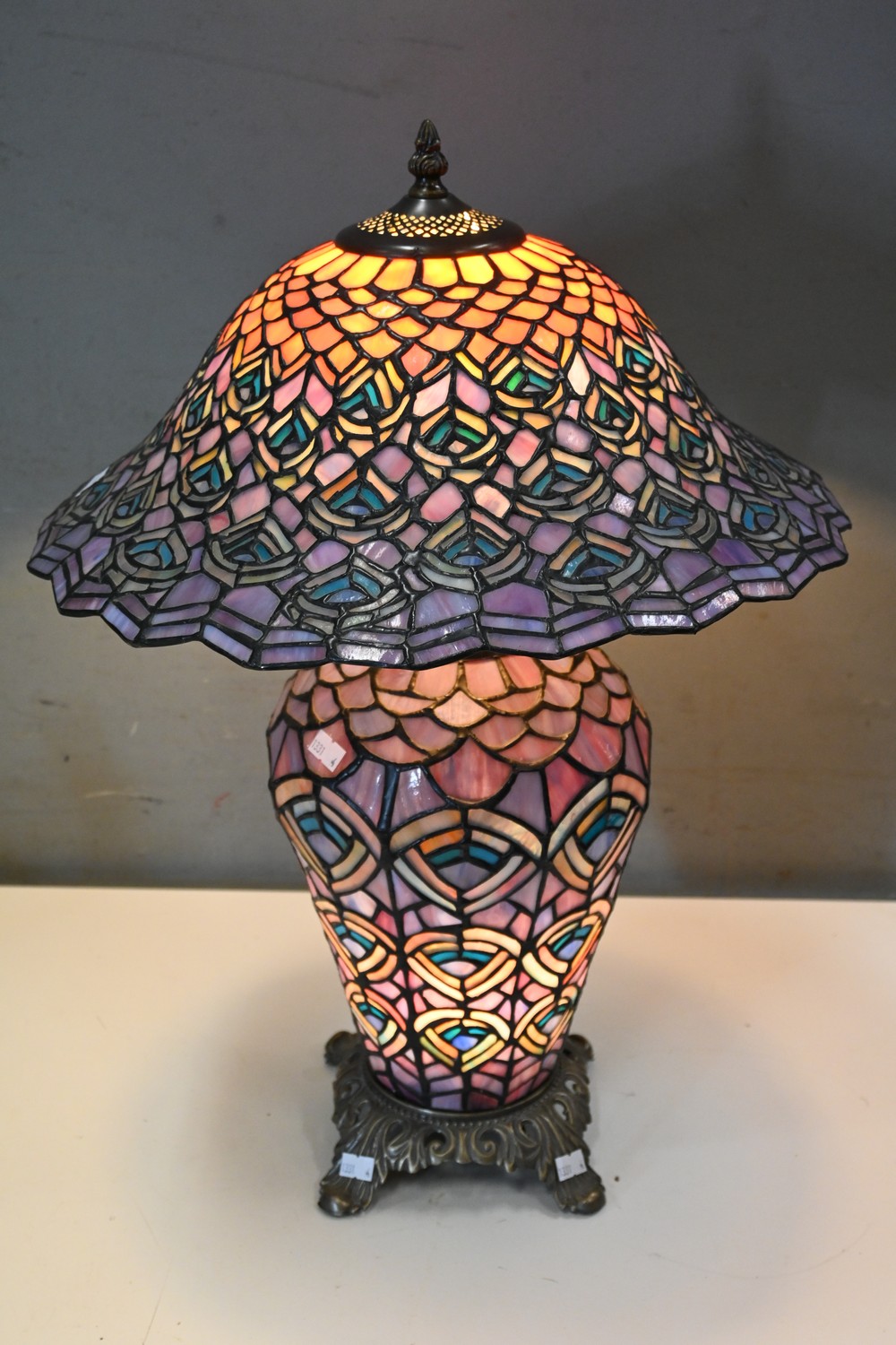 A PEACOCK LEADLIGHT LAMP ( 56H CM) (LEONARD JOEL DELIVERY SIZE: MEDIUM)