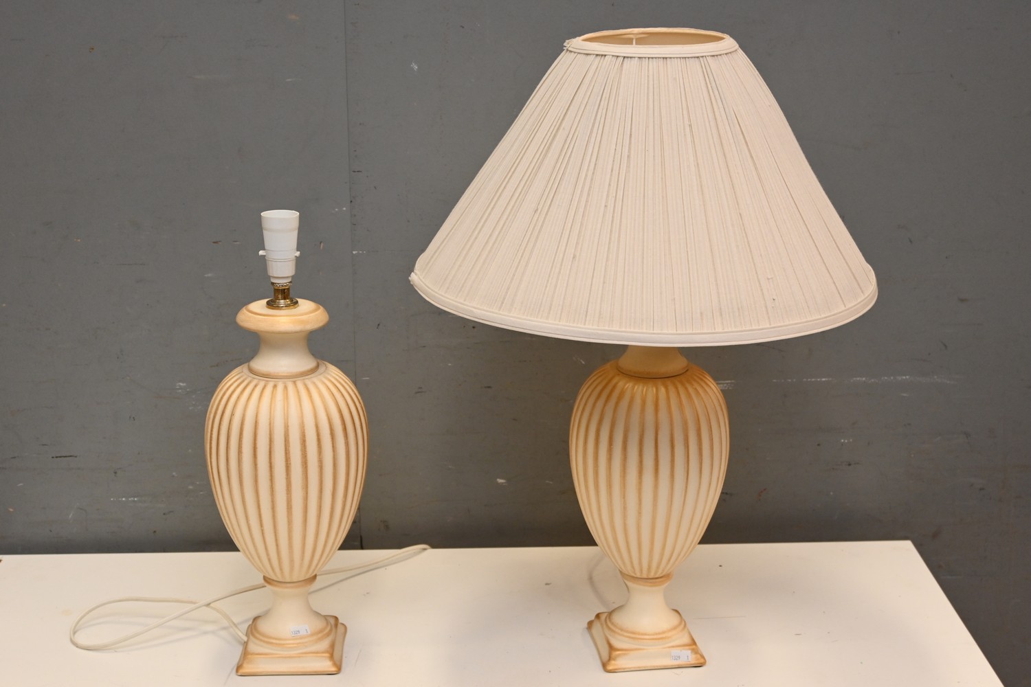 A PAIR OF DECORATIVE CERAMIC TABLE LAMPS (A/F) (ONE WITHOUT SHADE) (70H CM) (LEONARD JOEL DELIVERY SIZE: LARGE)