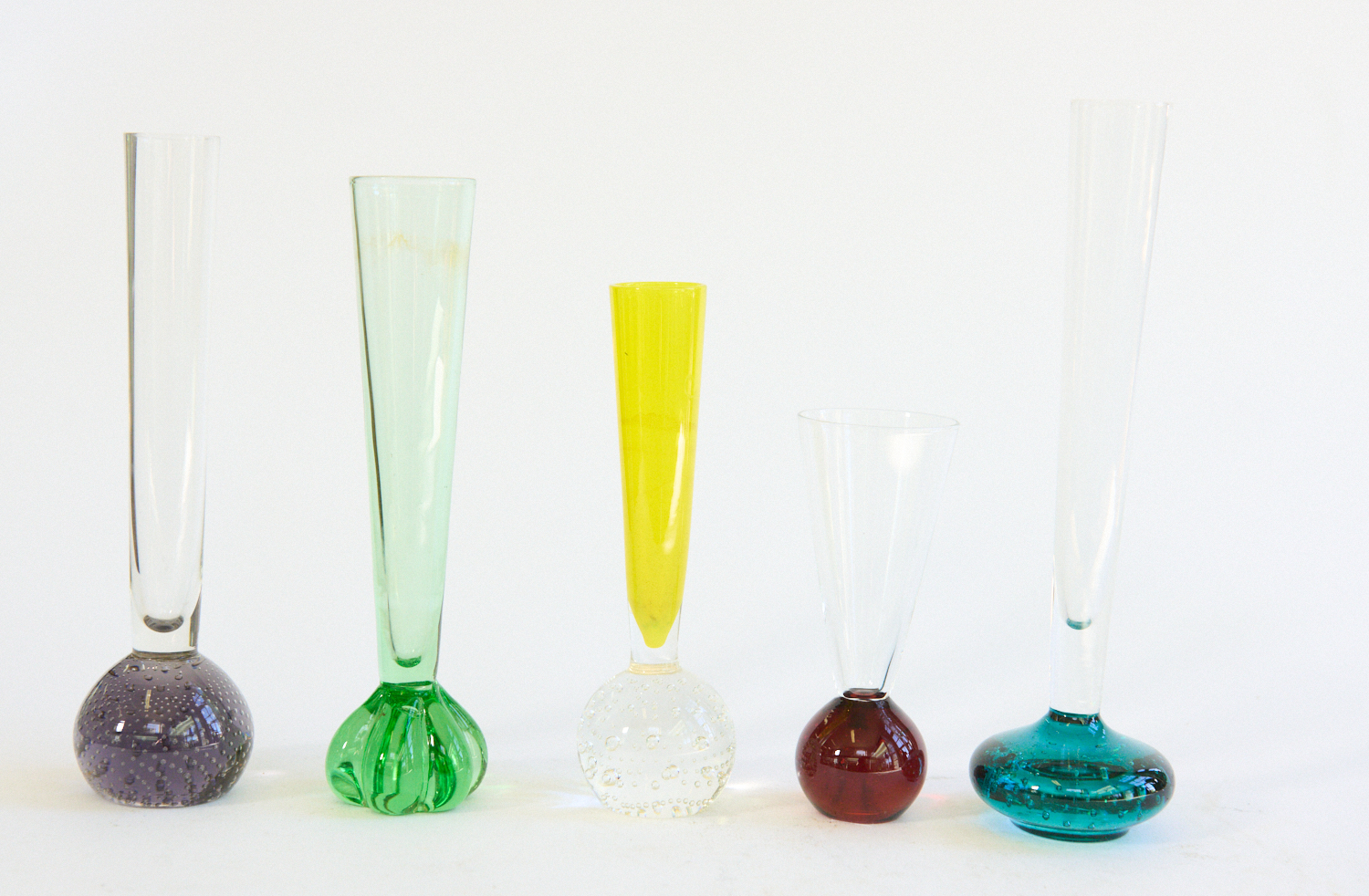 FIVE MID-CENTURY COLOURED GLASS SPECIMEN VASES (21CM HIGHEST), LEONARD JOEL LOCAL DELIVERY SIZE: MEDIUM
