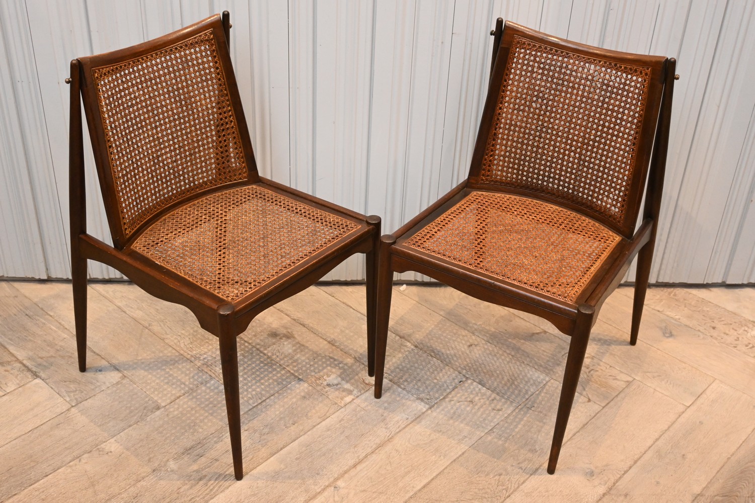 A PAIR OF 'JOHN DUDLEY' TEAK AND RATTAN CHAIRS (84H x 47W x 58D CM) (LEONARD JOEL DELIVERY SIZE: LARGE)