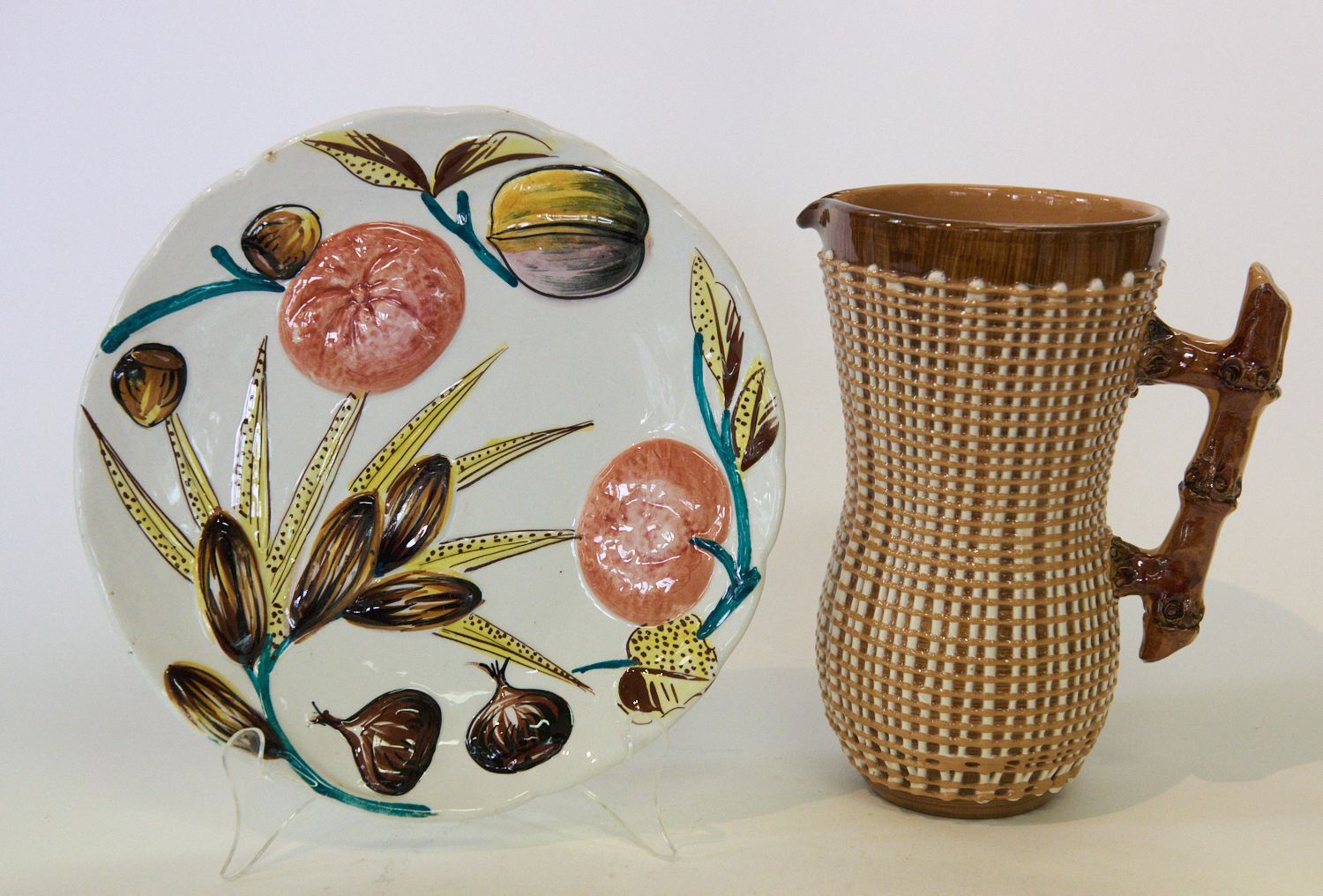 AN ITALIAN HAND-PAINTED CERAMIC PLATE AND JUG H.20CM, DIA.22CM, LEONARD JOEL LOCAL DELIVERY SIZE: SMALL