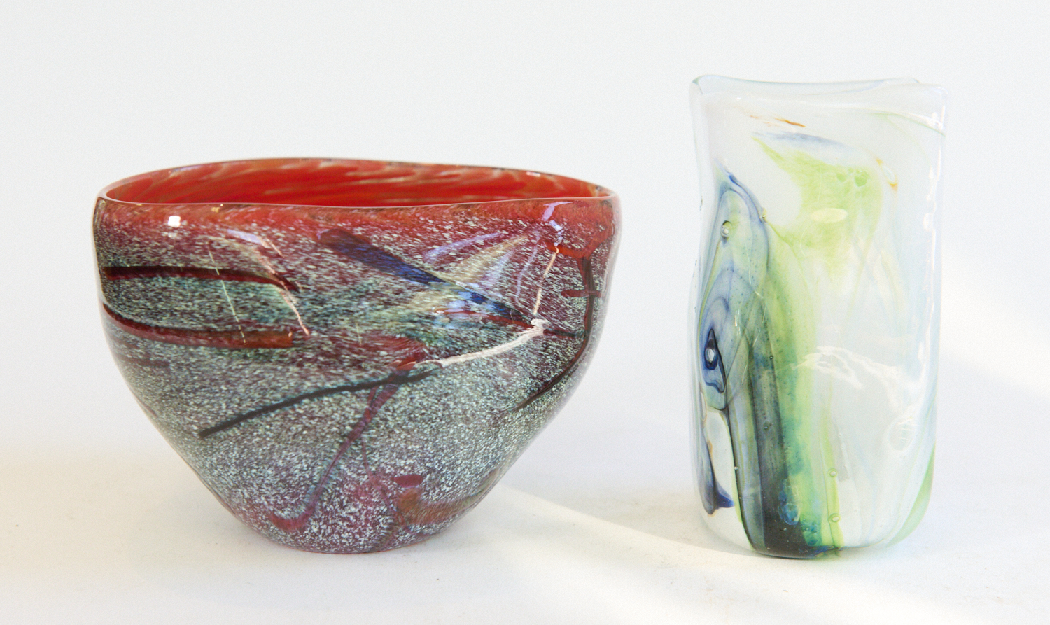 AN AUSTRALIAN STUDIO GLASS BOWL BY OGISHI MIZUNO AND ANOTHER SIGNED VASE (13CM HIGHEST), LEONARD JOEL LOCAL DELIVERY SIZE: SMALL