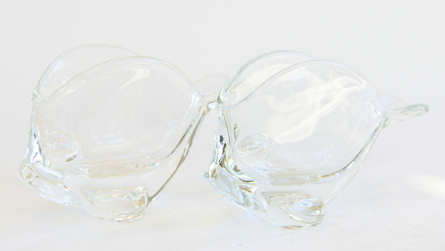 A FRENCH PAIR OF FISH SHAPED BOWLS BY CRISTAL VANNES LE CHATEL (10CM H), LEONARD JOEL LOCAL DELIVERY SIZE: SMALL
