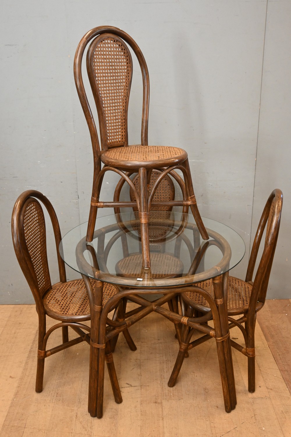 A FIVE PIECE CANE AND RATTAN DINING SETTING WITH A GLASS TOP ( 73H X 92 DIAMETER CM) (LEONARD JOEL DELIVERY SIZE: LARGE)