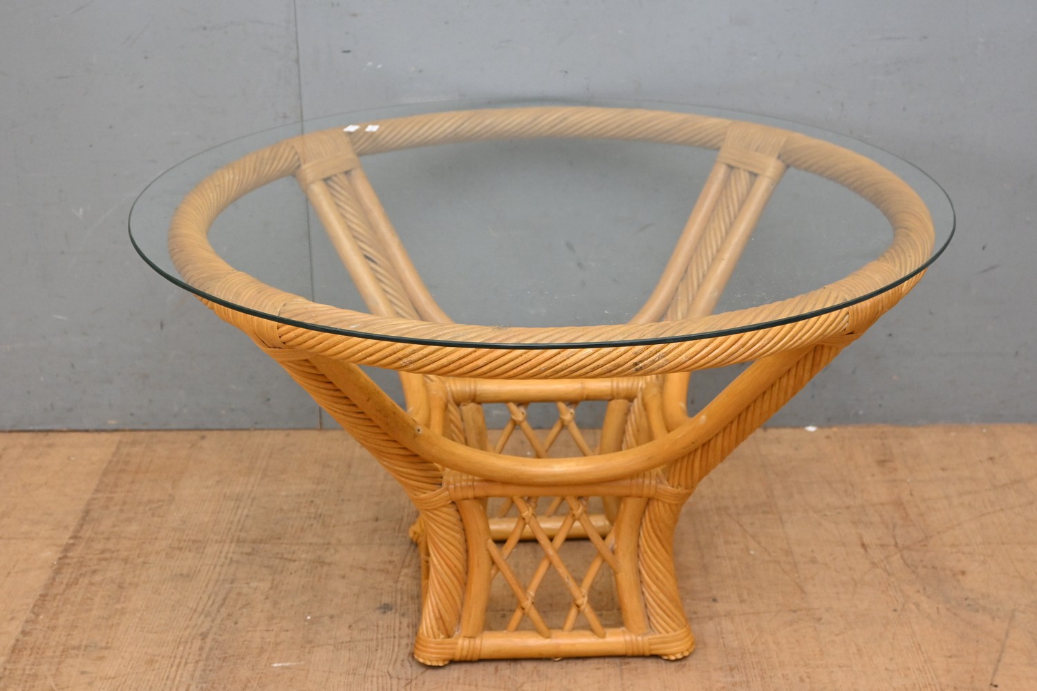 A CANE COFFEE TABLE WITH A GLASS TOP ( 47H X 81 DIAMETER CM) (LEONARD JOEL DELIVERY SIZE: LARGE)