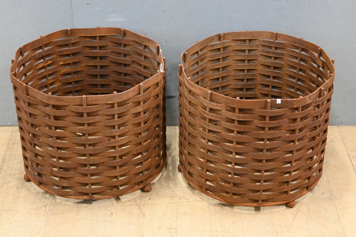 A PAIR OF METAL WEAVE PLANTERS ( 43H X 53 DIAMETER CM) (LEONARD JOEL DELIVERY SIZE: LARGE)