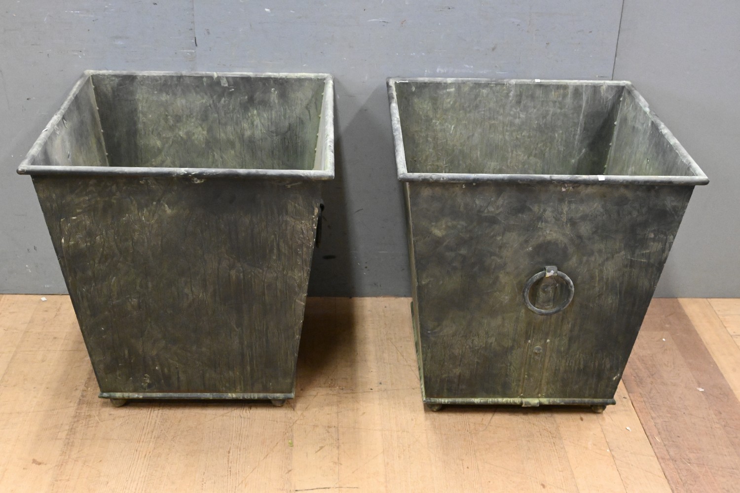 A PAIR OF LARGE METAL PLANTERS ( 69H X 65W X 65D CM) (PLEASE NOTE THIS HEAVY ITEM MUST BE REMOVED BY CARRIERS AT THE CUSTOMER'S EXPENSE. LEONARD JOEL STAFF CANNOT ASSIST CARRYING THIS ITEM) (X-LARGE ITEM)