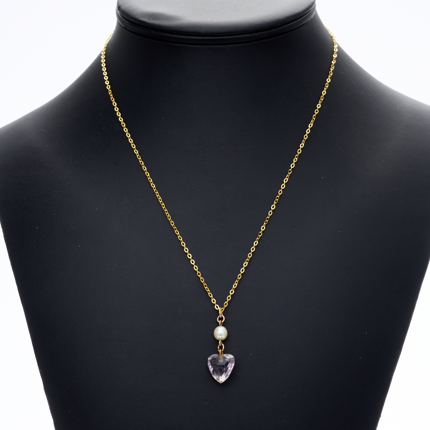 A CULTURED PEARL AND HEART SHAPED AMETHYST PENDANT TO A FINE TRACE CHAIN IN 9CT GOLD