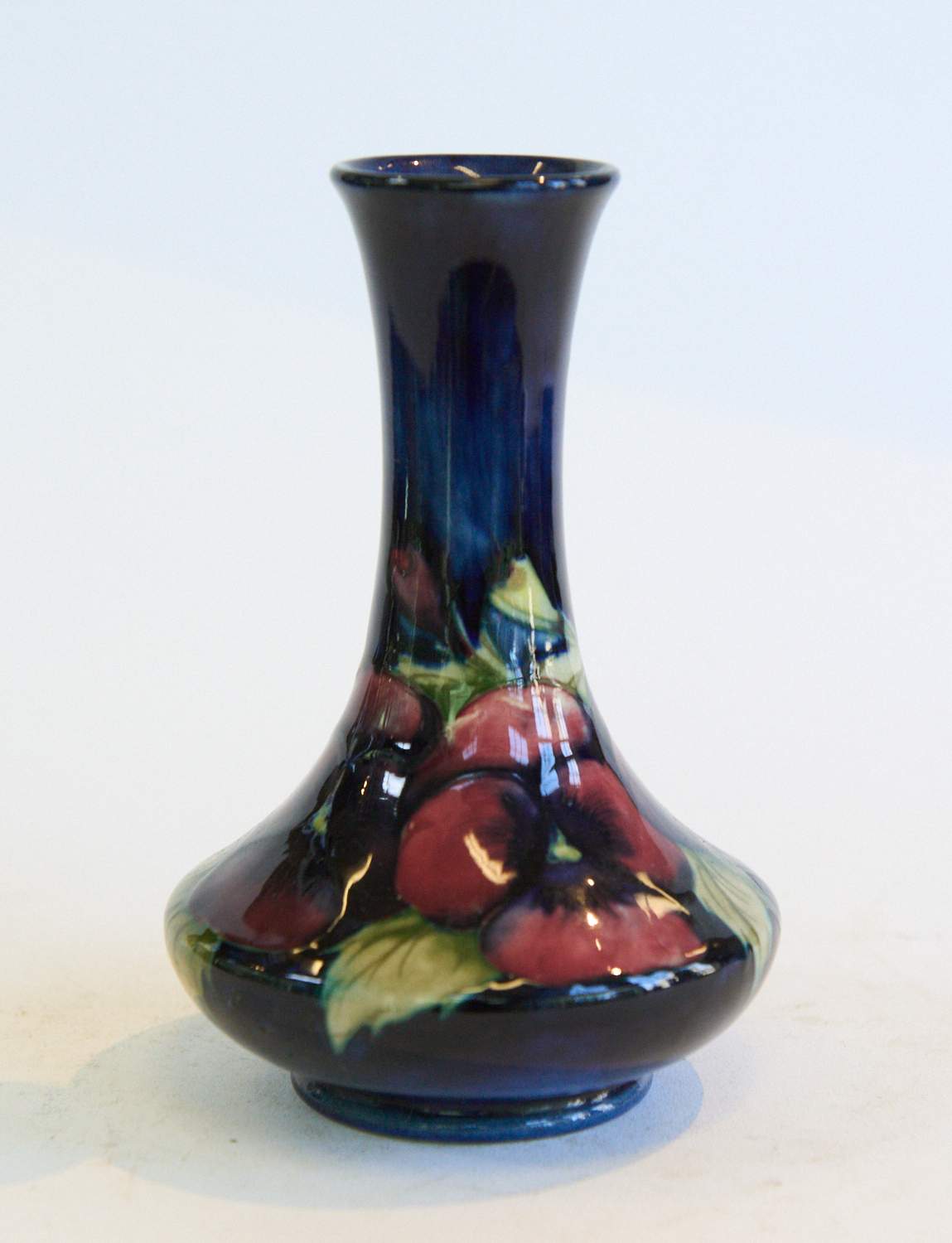 A SMALL MOORCROFT PANSY PATTERN VASE, BLUE INITIALS AND IMPRESSED MARK TO BASE H. 16CM, LEONARD JOEL LOCAL DELIVERY SIZE: SMALL