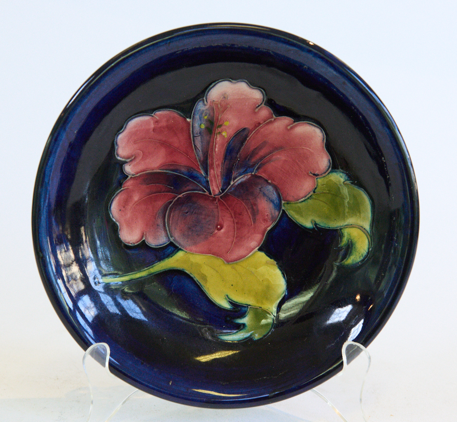 A SMALL MOORCROFT HIBISICUS PATTERN PLATE, BLUE INITIALS AND IMPRESSED MARK TO BASE DIA. 18CM, LEONARD JOEL LOCAL DELIVERY SIZE: SMALL