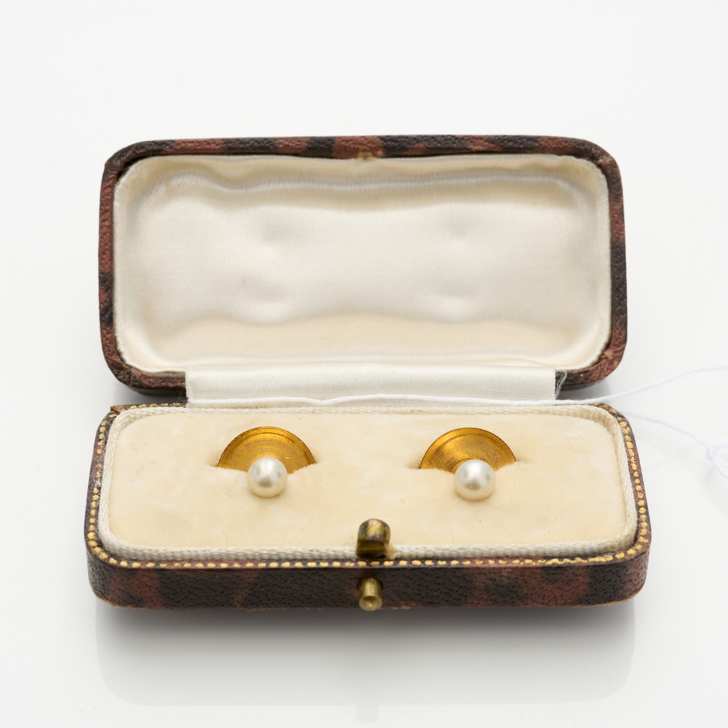 A PAIR OF PEARL SET SHIRT STUDS IN GOLD PLATE