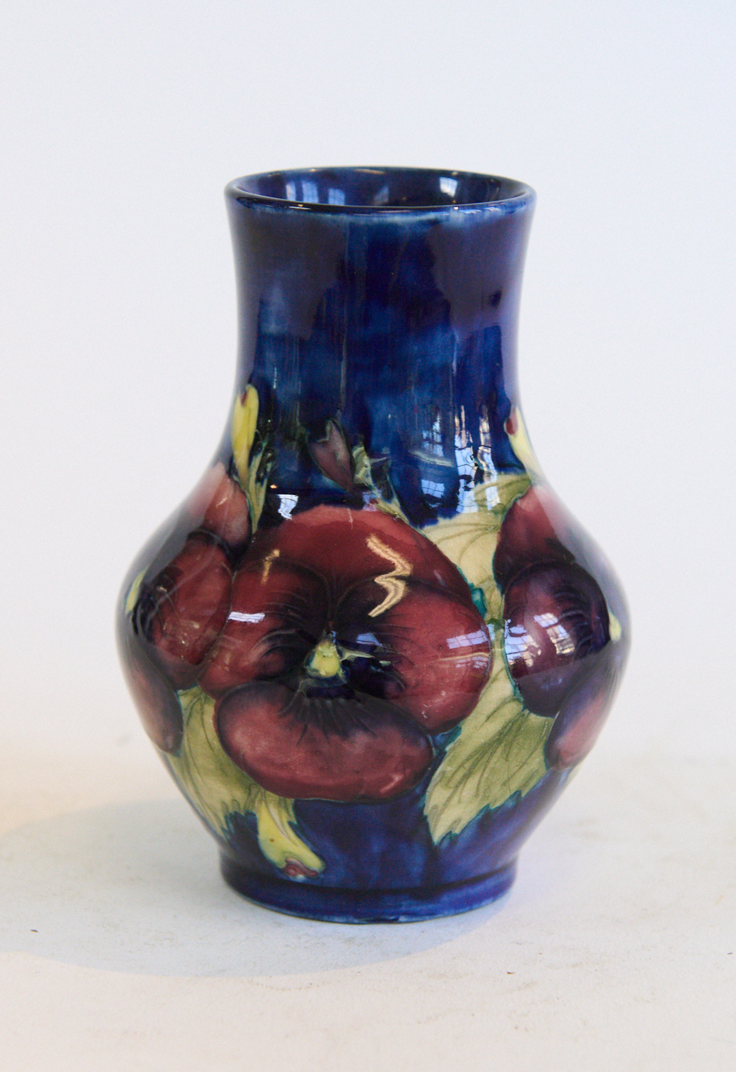 A SMALL MOORCROFT PANSY PATTERN VASE, BLUE INITIALS AND IMPRESSED MARK TO BASE H. 13CM, LEONARD JOEL LOCAL DELIVERY SIZE: SMALL