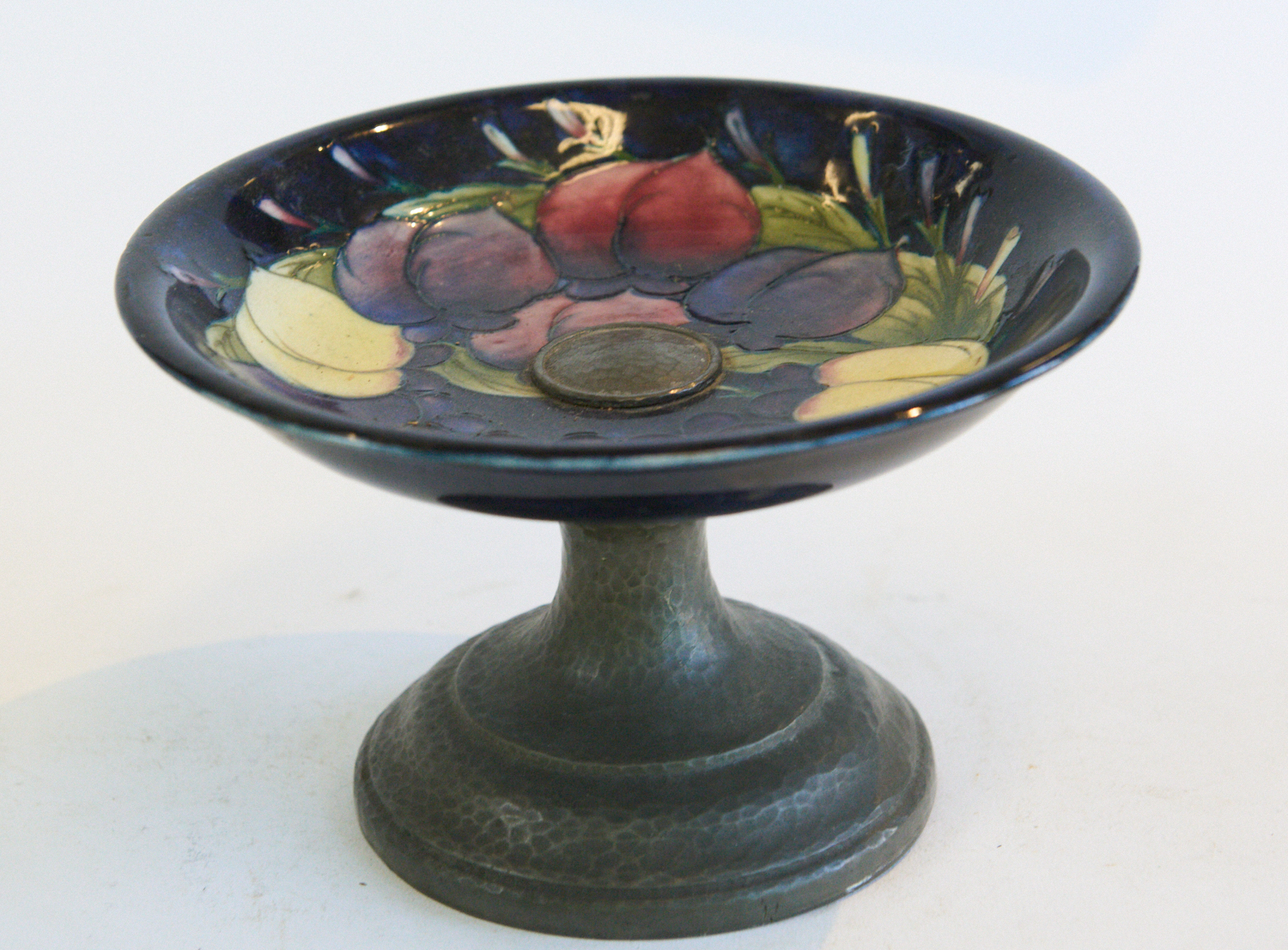 A MOORCROFT WISTERIA PATTERN CAKE STAND WITH PEWTER BASE, BLUE INITIALS AND IMPRESSED MARK TO BASE (A/F) H. 12CM AND DIA 18.5CM, LEONARD JOEL LOCAL DELIVERY SIZE: SMALL