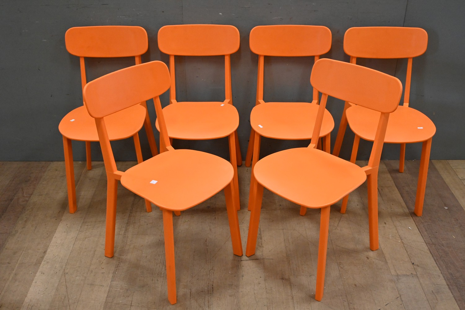 A SET OF SIX ORANGE CONTEMPORARY DINING CHAIRS ( 80H X 40W X 50D CM) (LEONARD JOEL DELIVERY SIZE: LARGE)