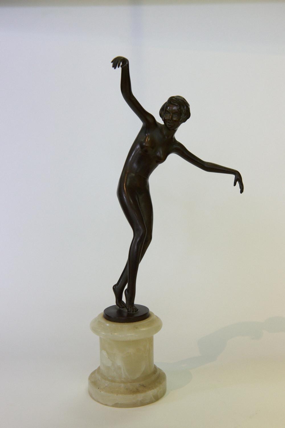 AN ART DECO BRONZE FIGURE ON ONYX BASE SIGNED LORENZL H.37CM, LEONARD JOEL LOCAL DELIVERY SIZE: MEDIUM
