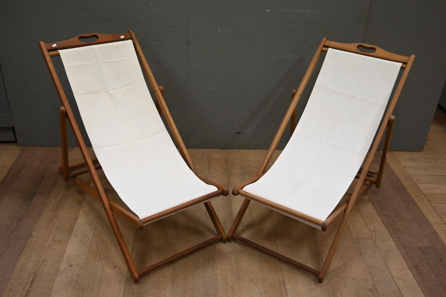 A PAIR OF TEAK FOLDING DECK CHAIRS (87H x 58W x 114D CM) (LEONARD JOEL DELIVERY SIZE: LARGE)