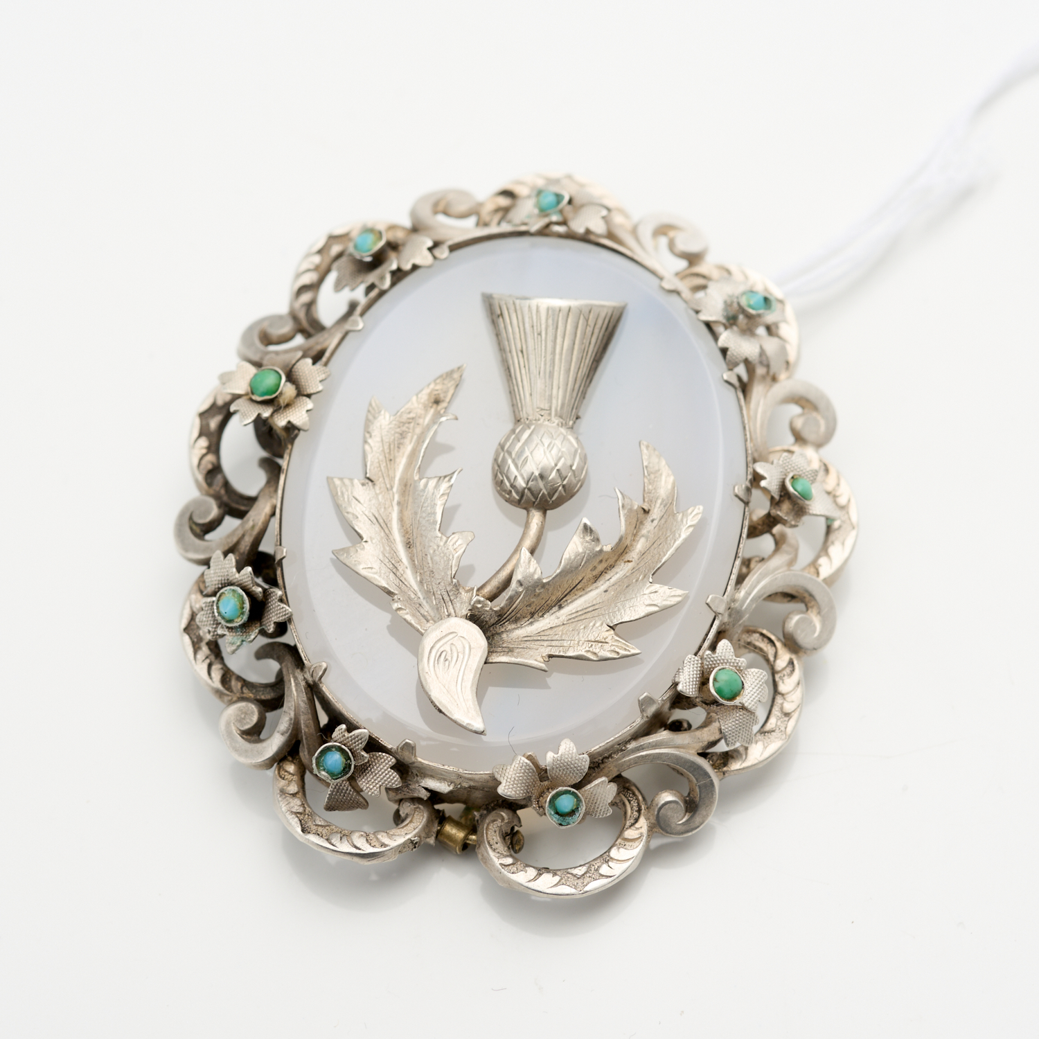 A VICTORIAN CHALCEDONY BROOCH IN SILVER FEATURING TURQUOISE DETAIL, APPROXIMATELY 50 X 45MM