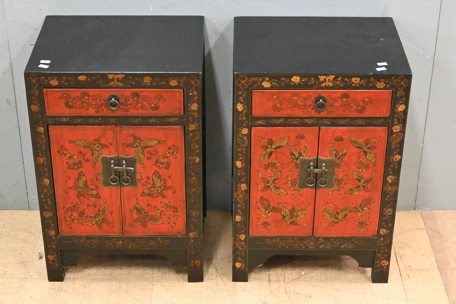 A PAIR OF CHINESE BLACK LACQUERED BEDSIDE CABINETS (61H x 40W x 32D CM) (LEONARD JOEL DELIVERY SIZE: LARGE)