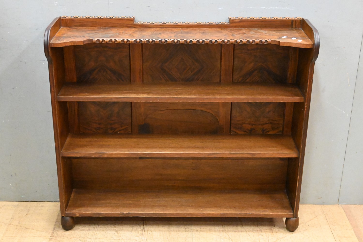 A WALNUT AND OAK OPEN BOOKSHELF (A/F) (95H x 107W x 20D CM) (LEONARD JOEL DELIVERY SIZE: LARGE)