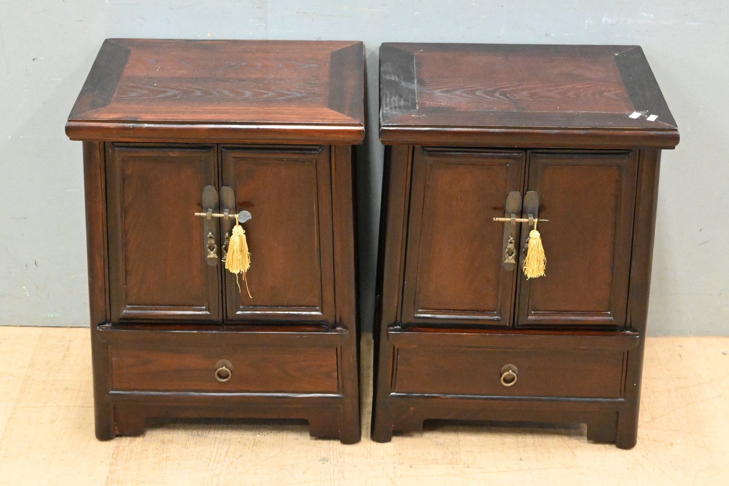 A PAIR OF CHINESE ELM BEDSIDE CABINETS (66H x 49W x 39D CM) (LEONARD JOEL DELIVERY SIZE: LARGE)