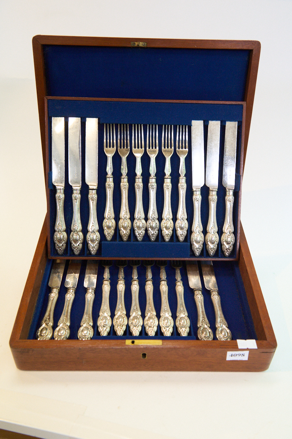 A SILVERPLATED SET OF 12 FORKS AND KNIVES (1 KNIFE MISSING), LEONARD JOEL LOCAL DELIVERY SIZE: SMALL