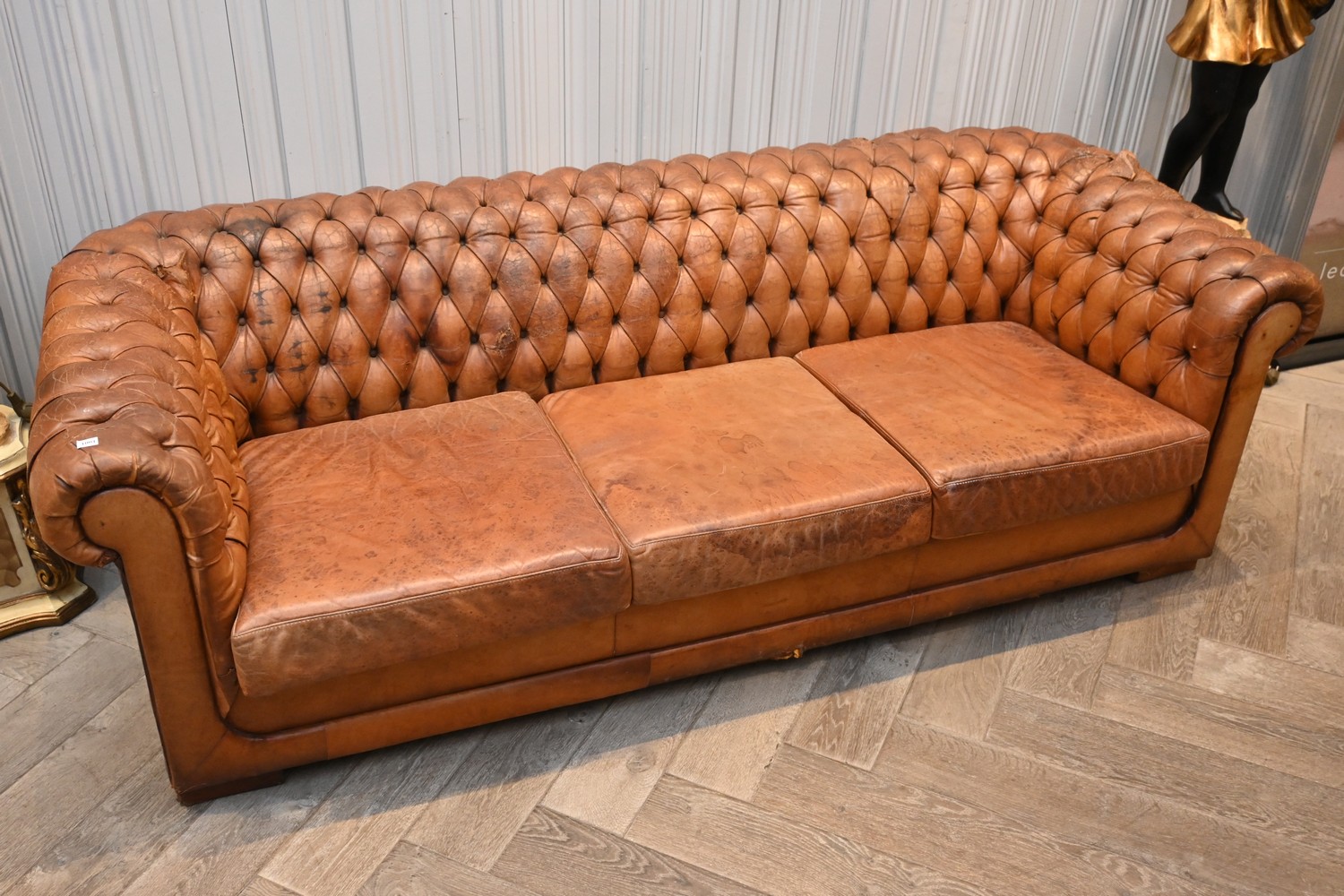 A LEATHER BUTTON BACK THREE SEAT SOFA (A/F) (67H x 220W x 90D CM) (PLEASE NOTE THIS HEAVY ITEM MUST BE REMOVED BY CARRIERS AT THE CUSTOMER'S EXPENSE. LEONARD JOEL STAFF CANNOT ASSIST CARRYING THIS ITEM) (X-LARGE ITEM)