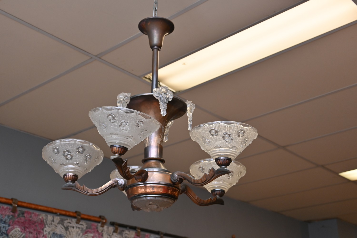 AN ART DECO FIVE BRANCH BRONZE AND GLASS CHANDELIER (70H x 90D CM) (LEONARD JOEL DELIVERY SIZE: LARGE)