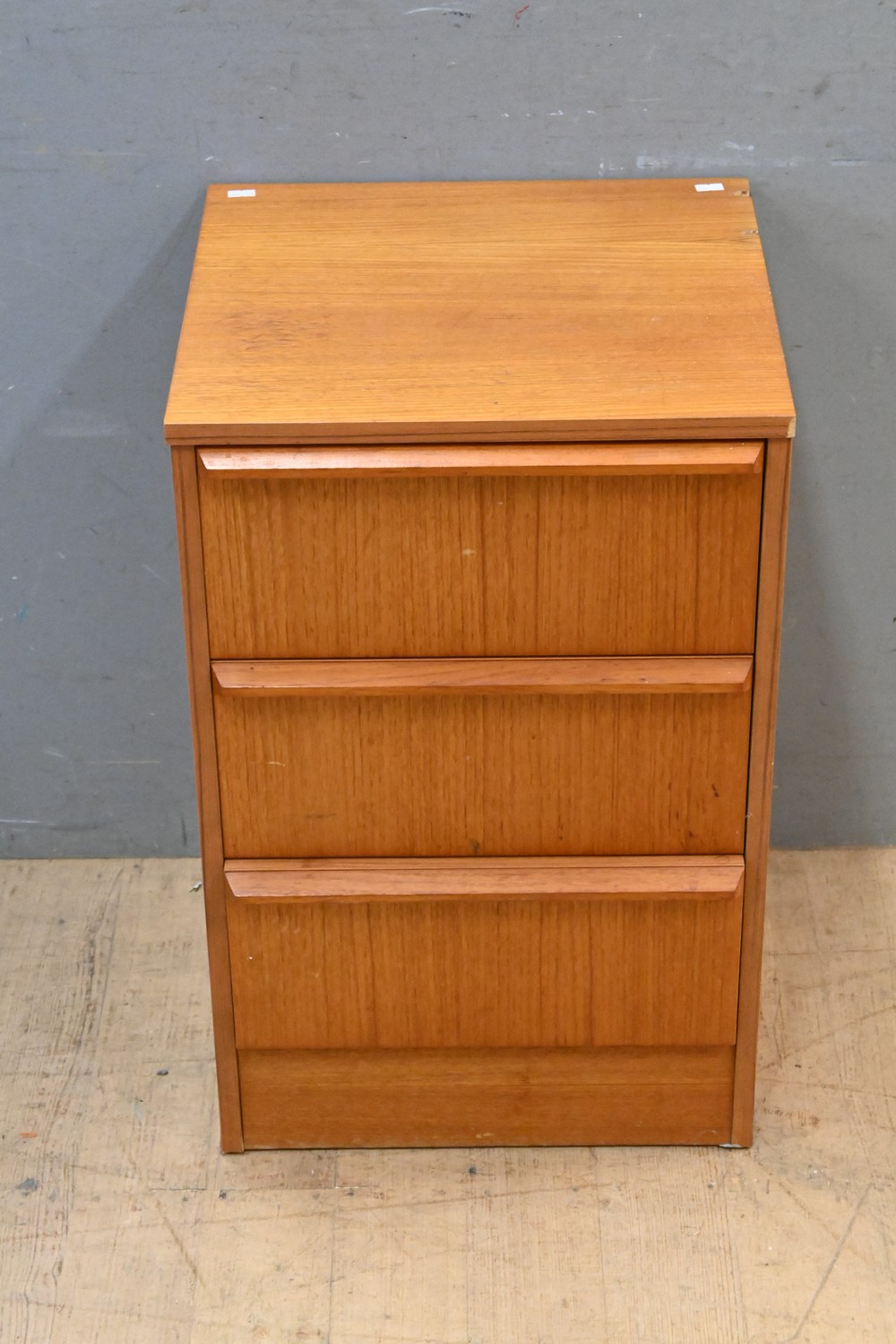 A MID-CENTURY BURGESS THREE DRAWER BEDSIDE (A/F) (69H x 44W x 43D CM) (LEONARD JOEL DELIVERY SIZE: LARGE)
