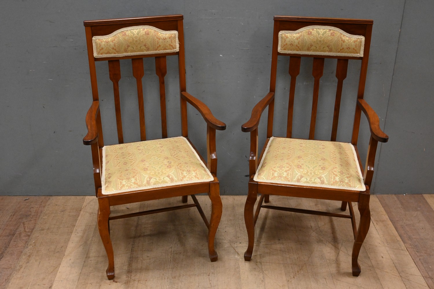 A PAIR OF ANTIQUE UPHOLSTERED SILK ARMCHAIRS (108H x 63W x 50D CM) (LEONARD JOEL DELIVERY SIZE: LARGE)