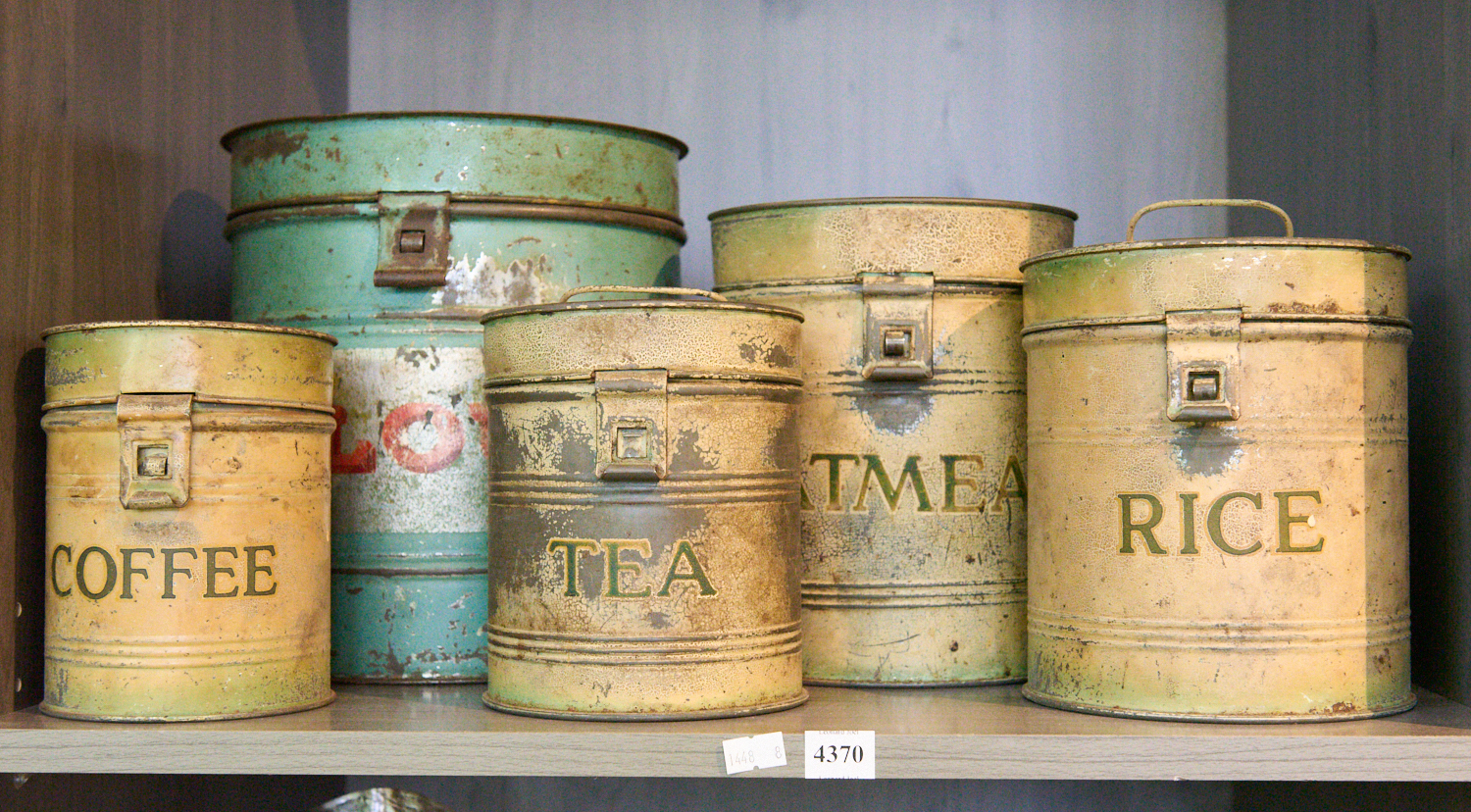 A SHELF OF VINTAGE KITCHEN CANNISTERS, LEONARD JOEL LOCAL DELIVERY SIZE: MEDIUM