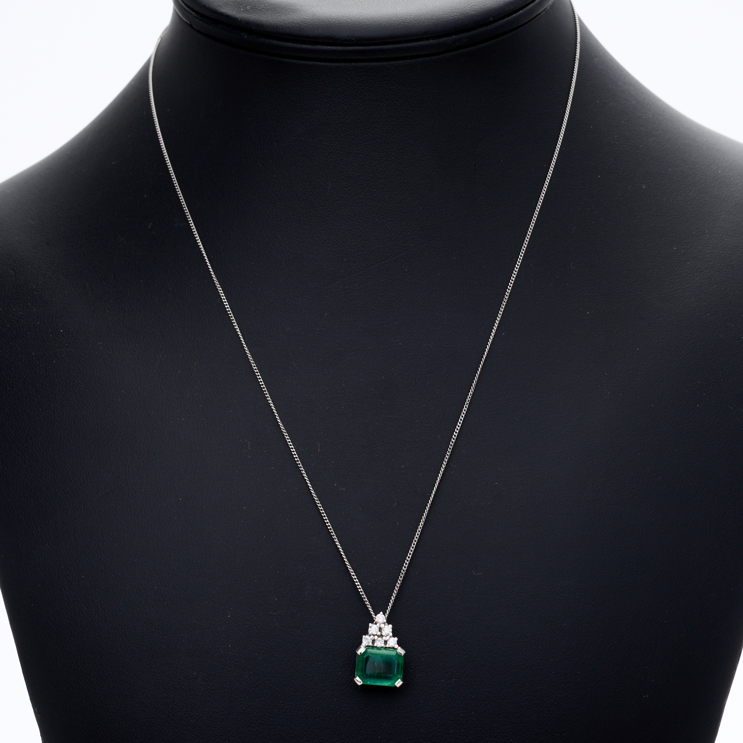 AN EMERALD AND DIAMOND PENDANT IN 18CT WHITE GOLD, TO A FINE CHAIN IN SILVER