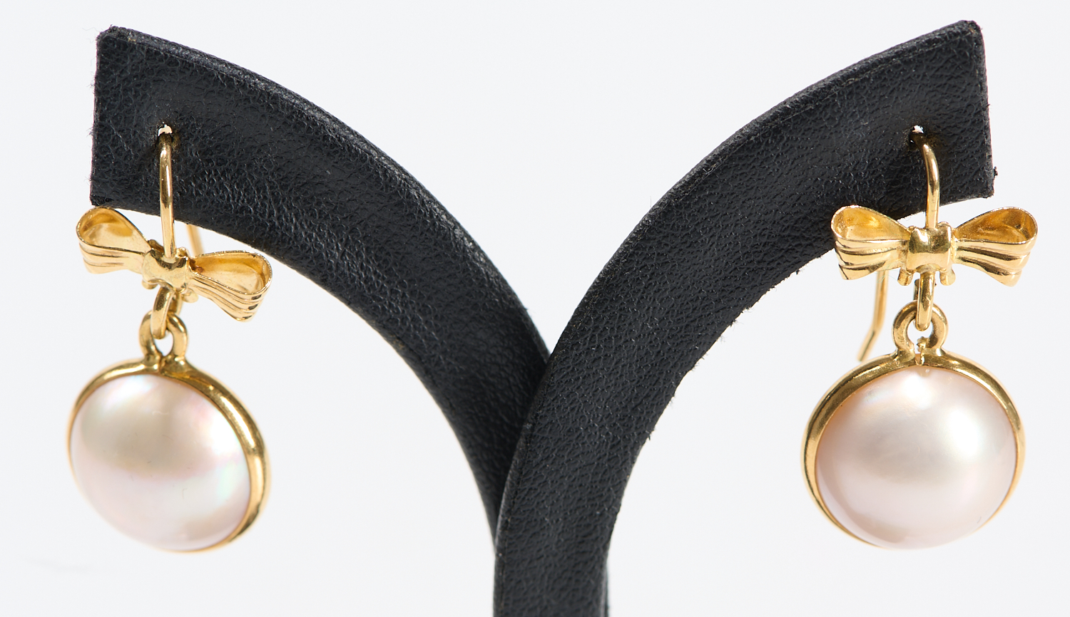 A PAIR OF MABE PEARL DROP EARRINGS IN 18CT GOLD WITH BOW DEATILING, TO SHEPHERDS HOOK FITTINGS