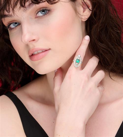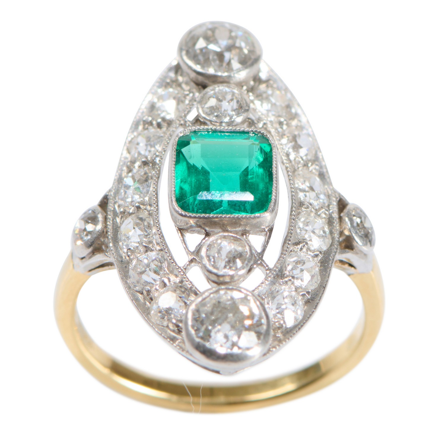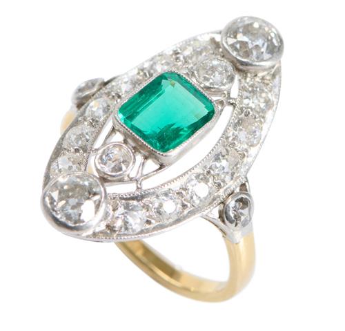 Of plaque design, centring an emerald-cut emerald weighing approximately 0.95 carats, within an open surround detailed with old European-cut diamonds together weighing approximately 1.80 carats, ring size M.