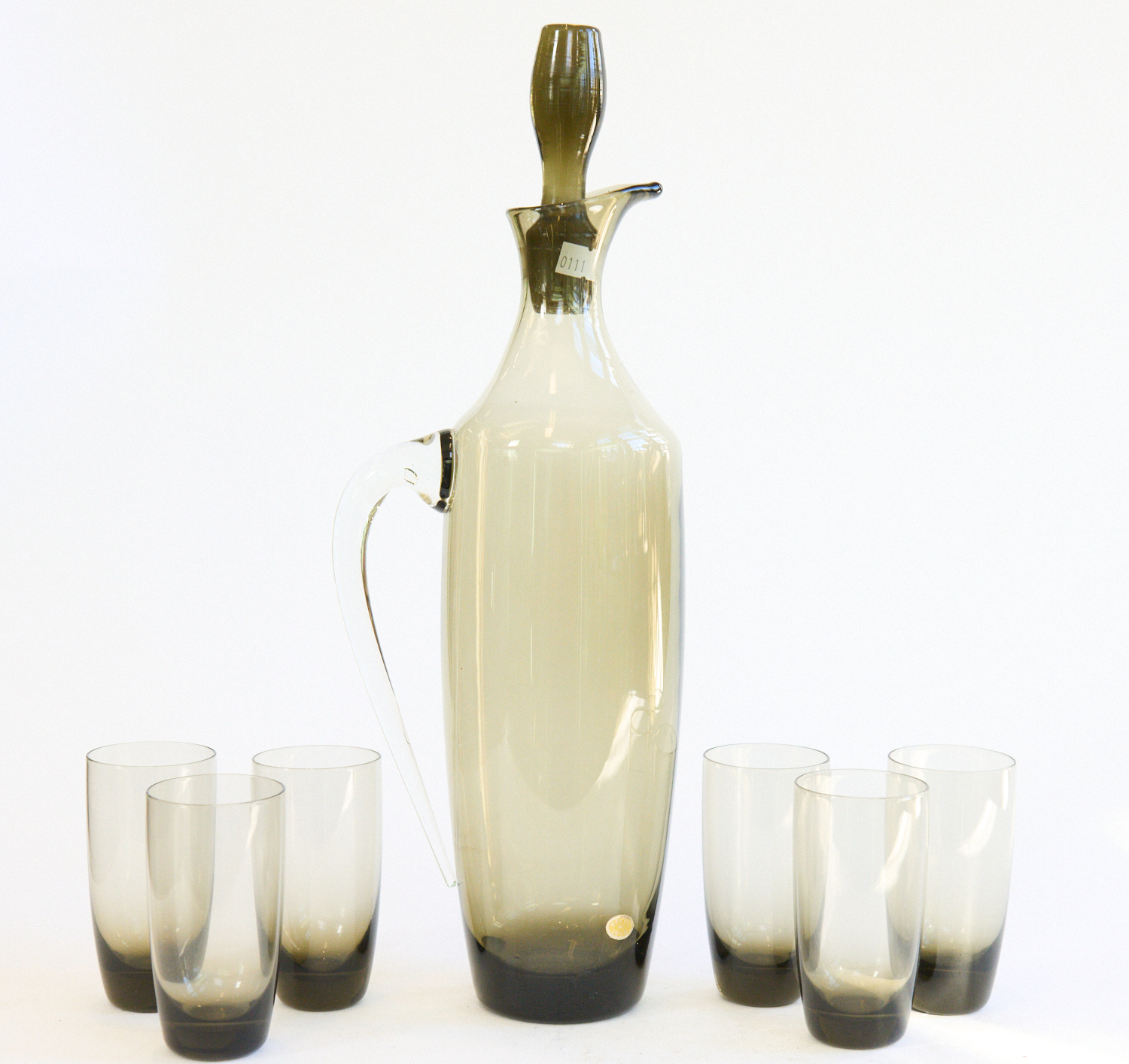A RETRO SMOKEY GLASS DRINK SET FOR SIX, LEONARD JOEL LOCAL DELIVERY SIZE: MEDIUM