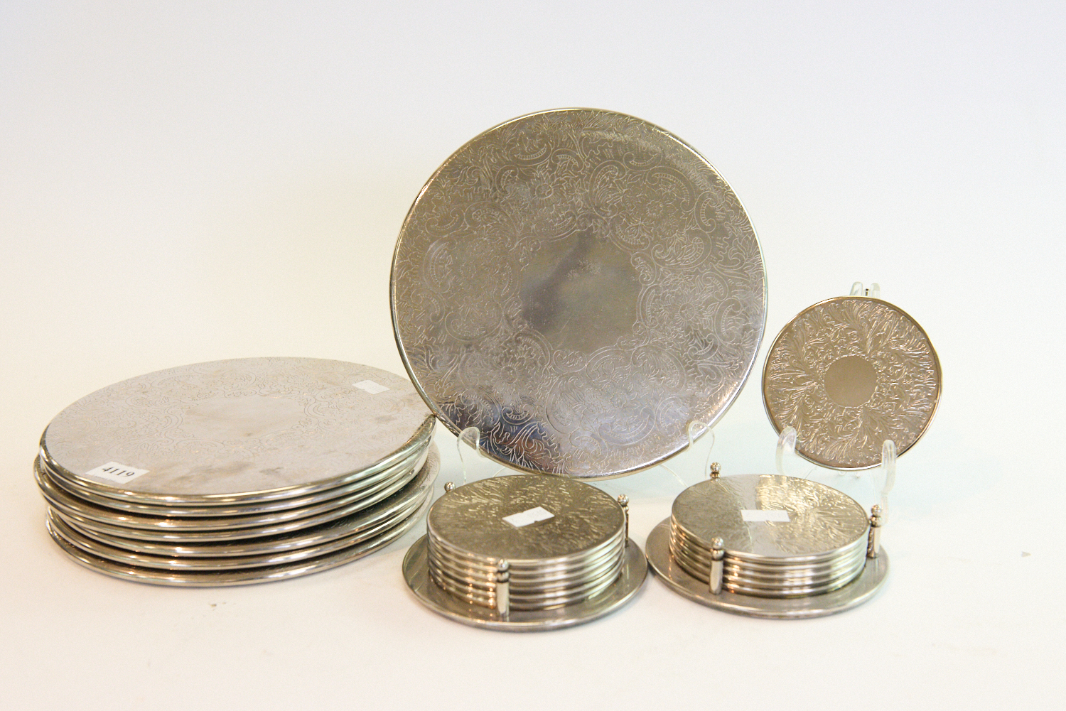 A SET OF EIGHT SILVERPLATED COASTERS DIA. 20CM TOGETHER WITH 12 DRINK COASTERS DIA. 9CM, LEONARD JOEL LOCAL DELIVERY SIZE: SMALL