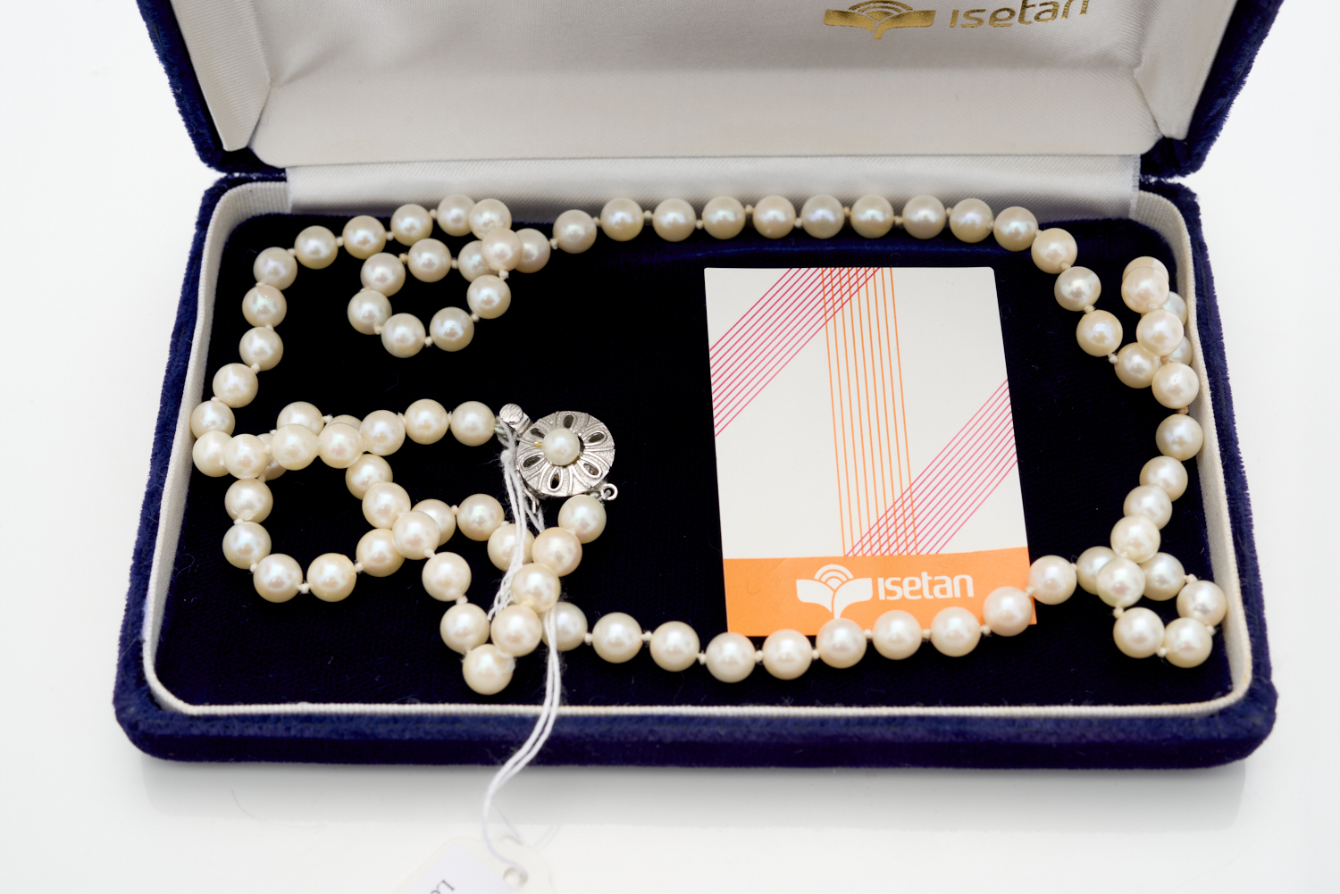 A STRAND OF CULTURED PEARLS BY ISETAN, TO A CLASP IN SILVER, LENGTH APPROXIMATELY 652MM