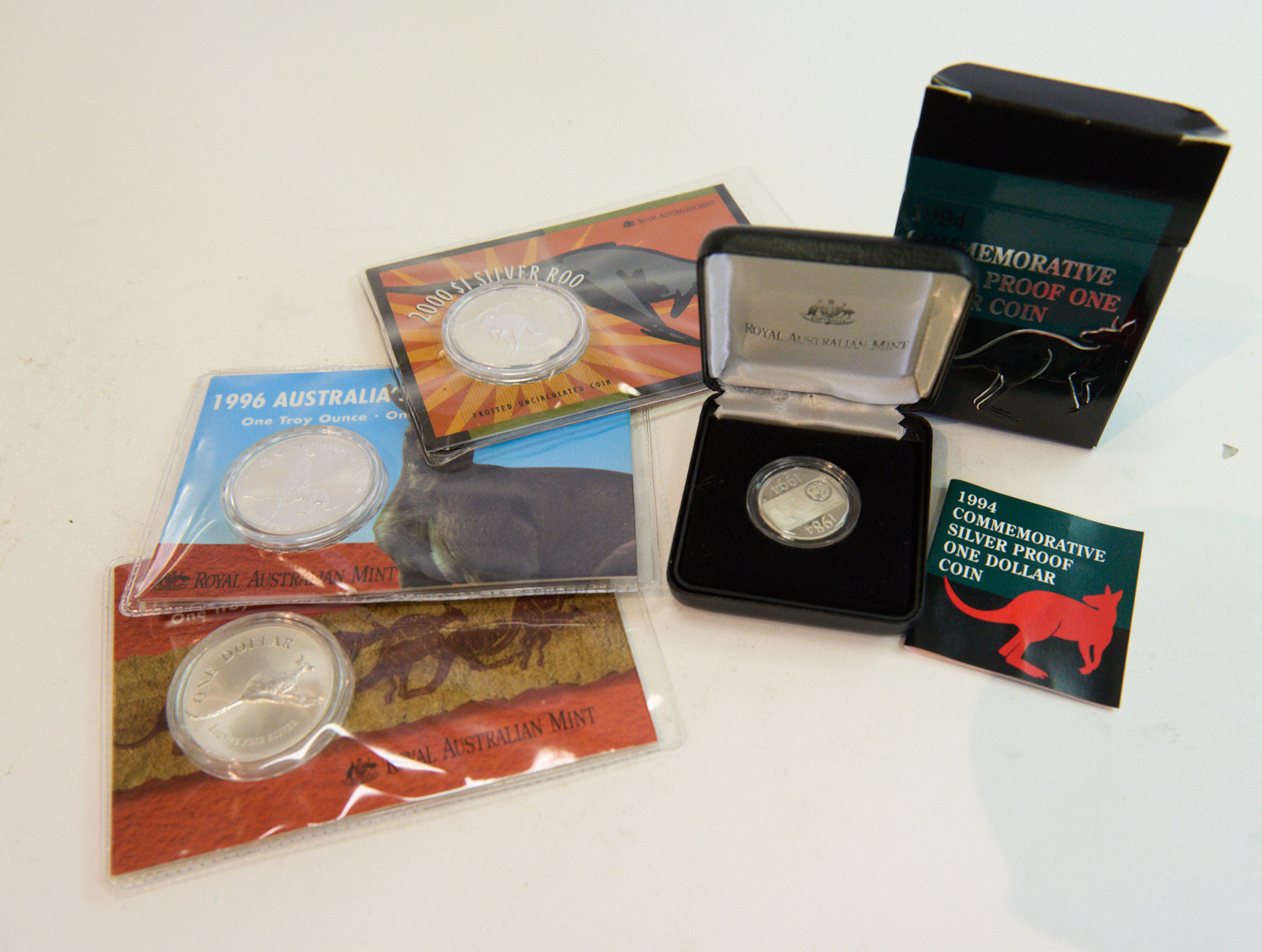 FOUR ROYAL AUSTRALIAN MINT COMMEMORATIVE SILVER PROOF ONE DOLLAR COINS INCLUDING 1994, 2000, 1996 AND 1994 NOTE TO COIN COMMEMORATIVE COIN, LEONARD JOEL LOCAL DELIVERY SIZE: SMALL