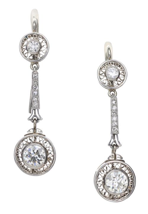 Each earring composed of an old European-cut diamond weighing approximately 0.75 carats, within an open-work border, suspended on a diamond drop and conforming detachable diamond surmount weighing approximately 0.22 carats, to European hook fittings, lengths 45mm and 15mm.