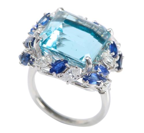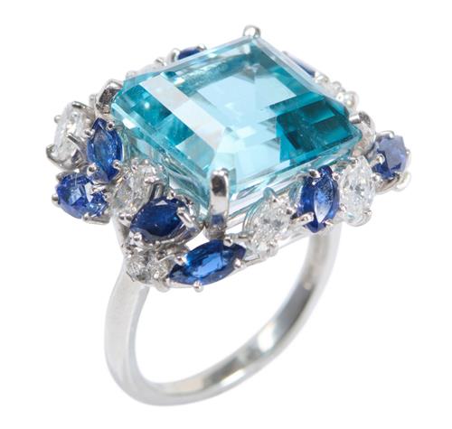 Centring a square emerald-cut aquamarine weighing approximately 11.57 carats, within a cluster border of marquise-cut sapphires and diamonds together weighing approximately 1.00 carats and 1.15 carats respectively, ring size L.