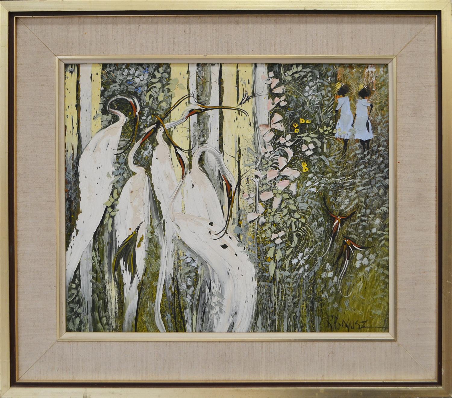 RICHARD BOGUSZ, UNTITLED (EGRETS AND CHILDREN), OIL ON BOARD, 36 X 44CM. CONDITION: SOME CRACKING PRESENT, AREA OF PAINT LOSS IN LEFT SIDE, APPROX. 1.5CM
