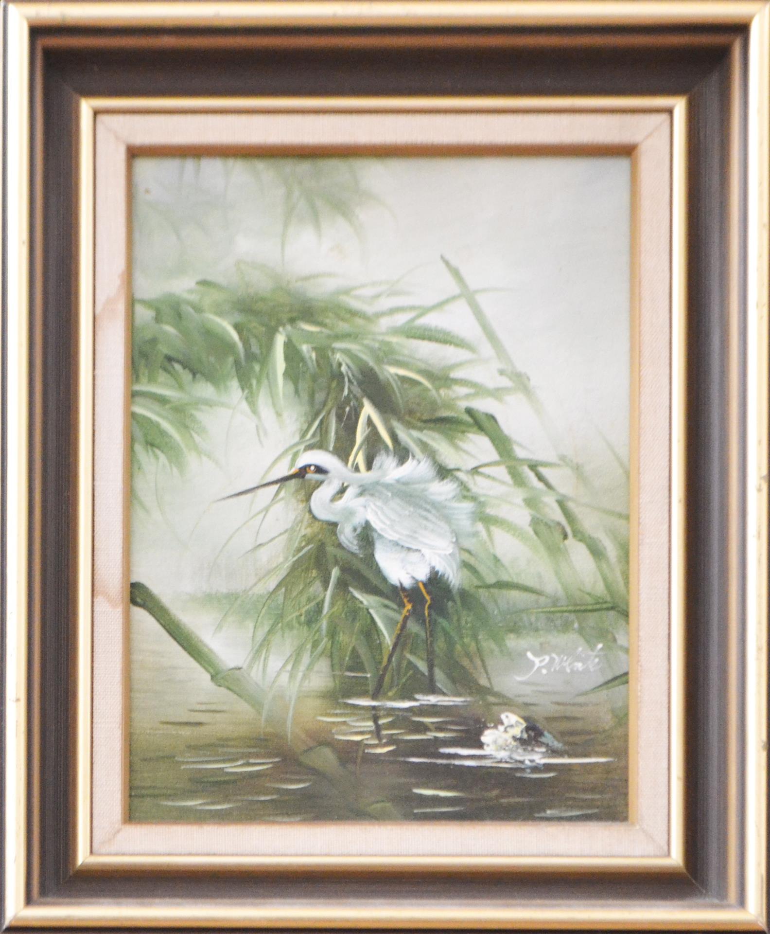 P. WHITE, UNTITLED (HERON), OIL ON BOARD, 25 X 19CM