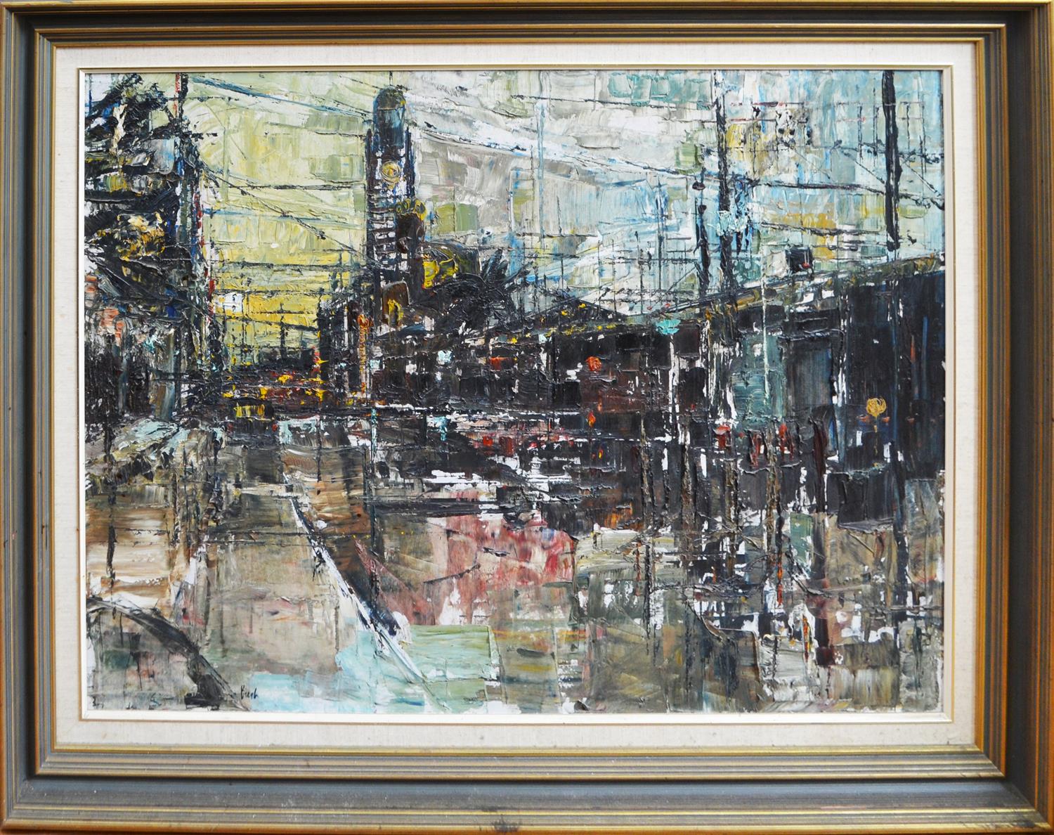 SIGNED BRUK, ABSTRACT STREETSCAPE, OIL ON PANEL, 75 X 100CM