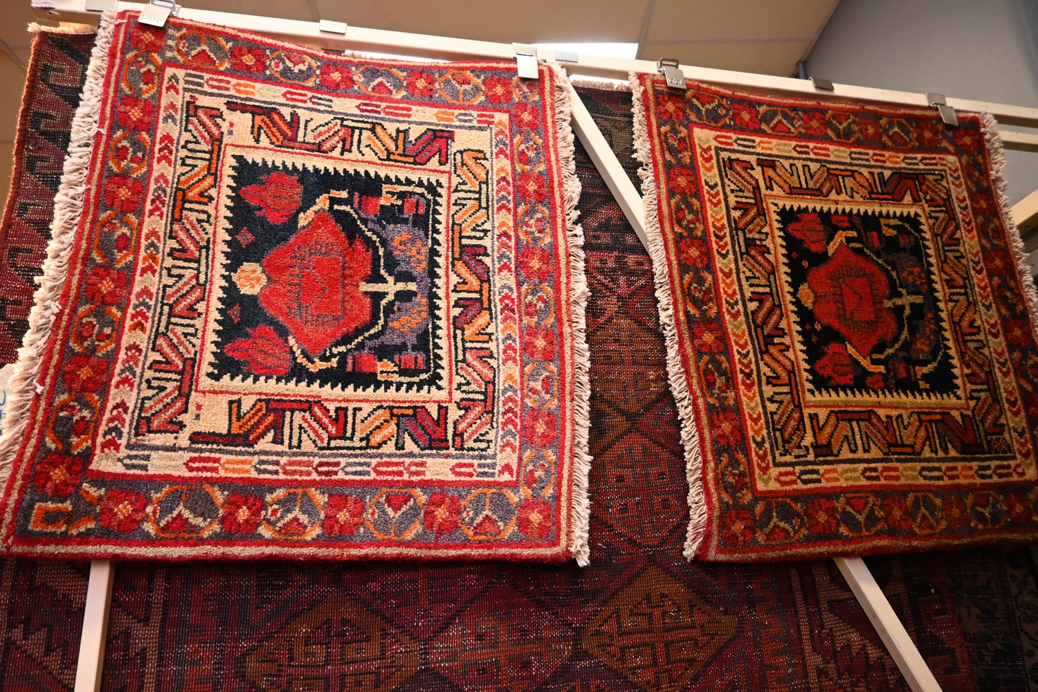 TWO PERSIAN NOMADIC SIRJAN AFSHAR ENTRANCE RUGS. 100% WOOL, SOLID AND DENSE. HAND-KNOTTED NOMADIC WEAVE & DESIGN OF A CENTRAL TRIBAL MEDALLION AND SYMMETRICAL CROSS-SHAPED TRIBAL MOTIFS IN A CREAM FIELD. BORDER OF ROSETTES. ORIGIN: IRAN - SIZE: 73 X 63CM