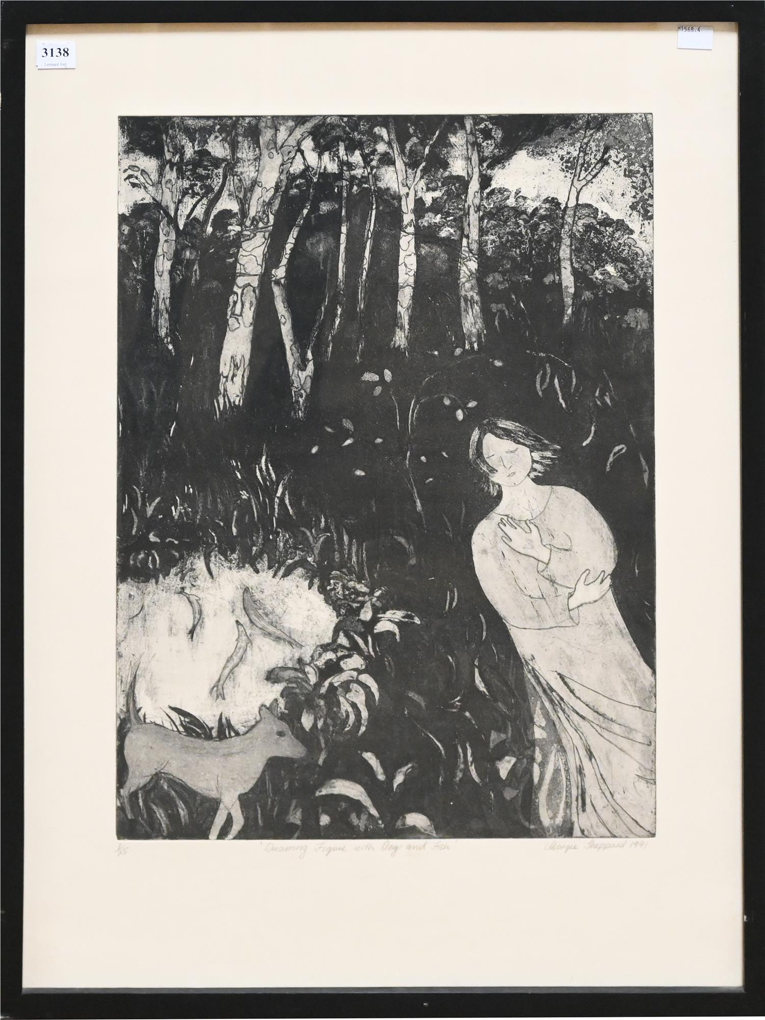MARGIE SHEPPARD, DREAMING FIGURE WITH DOG AND FISH 1991, ETCHING 1/5, 50 X 35CM