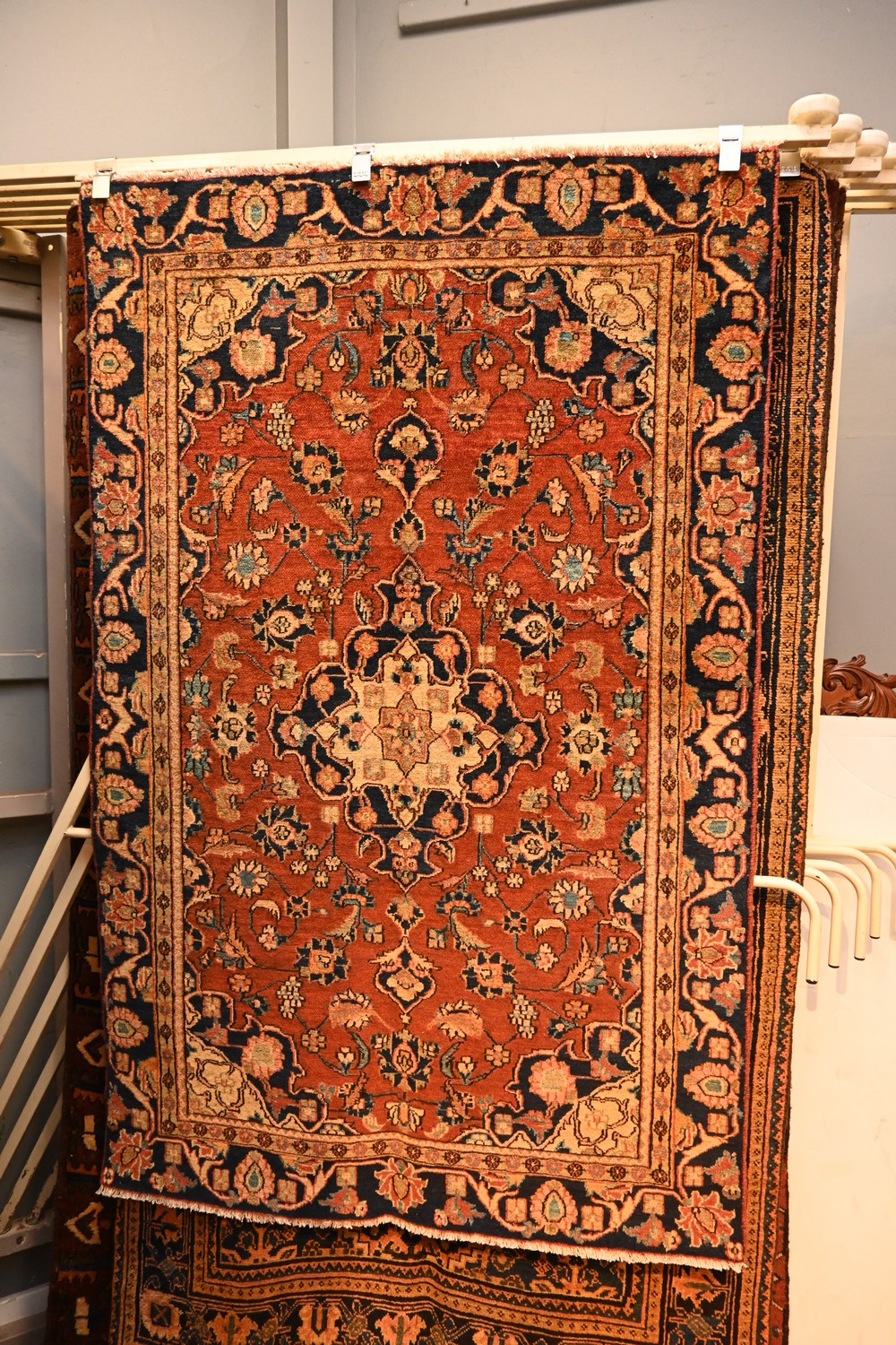 A CIRCA 1960'S PERSIAN SAROUQ RUG. VINTAGE PILE. CLASSIC SAROUQ DESIGN MEDALLION AND QUARTERED CORNER MEDALLIONS OF PALMETTES IN A RED FIELD OF PALMETTES, BLOSSOMING FLORAL SPRAYS AND TENDRILS. BORDER OF PALMETTES AND TENDRILS ON A ROYAL BLUE FIELD. SIZE: 190 X 123CM. ORIGIN: IRAN – RRP: $2,400