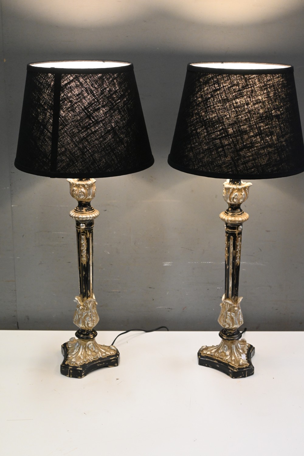 A PAIR OF FRENCH STYLE BLACK AND GILT TABLE LAMPS (84H CM) (LEONARD JOEL DELIVERY SIZE: LARGE)