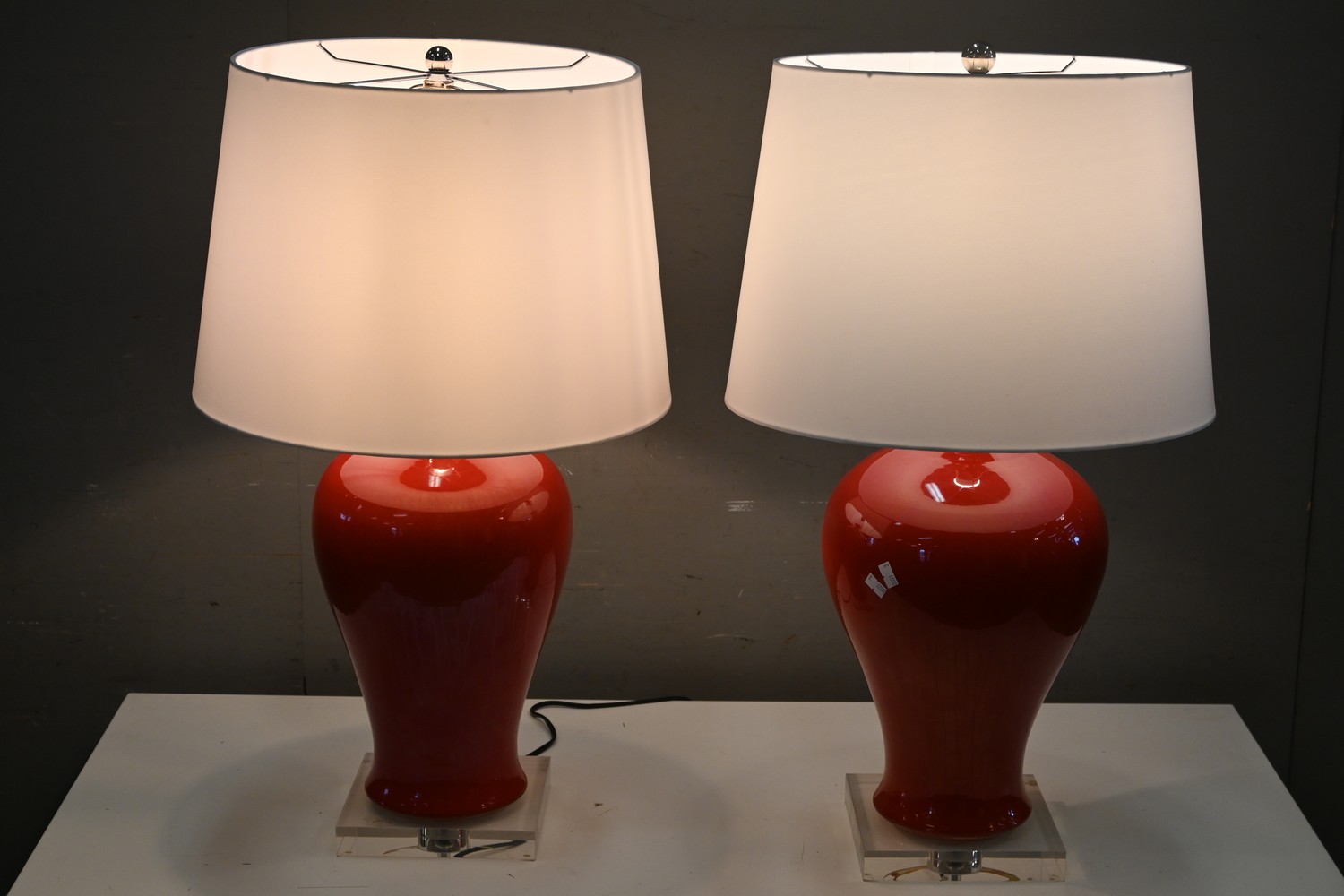 A PAIR OF RED PORCELAIN TABLE LAMPS WITH PERSPEX BASES (75H CM) (LEONARD JOEL DELIVERY SIZE: LARGE)