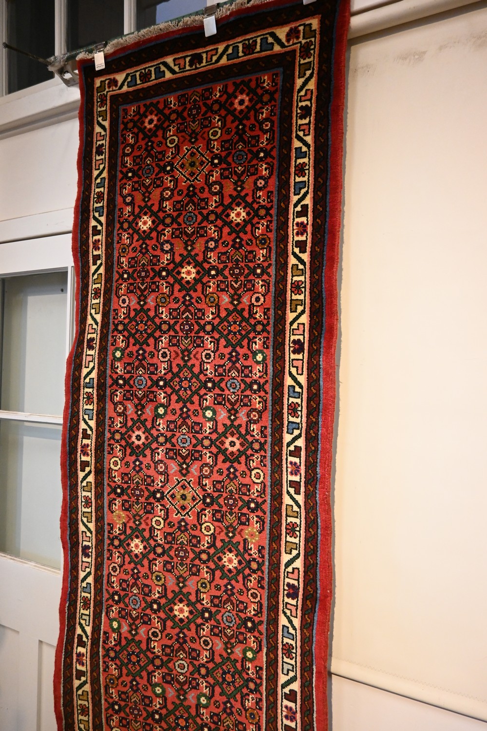 A PERSIAN HOSSAINABAD HALL RUNNER. 100% WOOL. SOLID & DENSE PILE. HAND-KNOTTED VILLAGE WEAVE FROM THE HAMADAN REGION WITH TRIBAL DESIGN OF ALL-OVER BOLD HERATI MAHI PATTERNS IN A RED FIELD. BORDER OF TRIBAL MOTIFS IN A CREAM FIELD. SOLID & HARD-WEARING. IN PRISTINE CONDITION. SIZE: 500 X 80CM ORIGIN: PERSIAN – RRP: $3,800