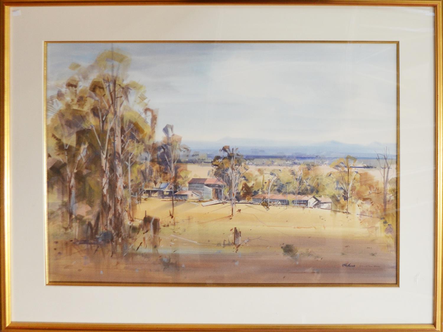 JOHN BORRACK, RED BARNS AT MERNDA, WATERCOLOUR, 73 X 105CM