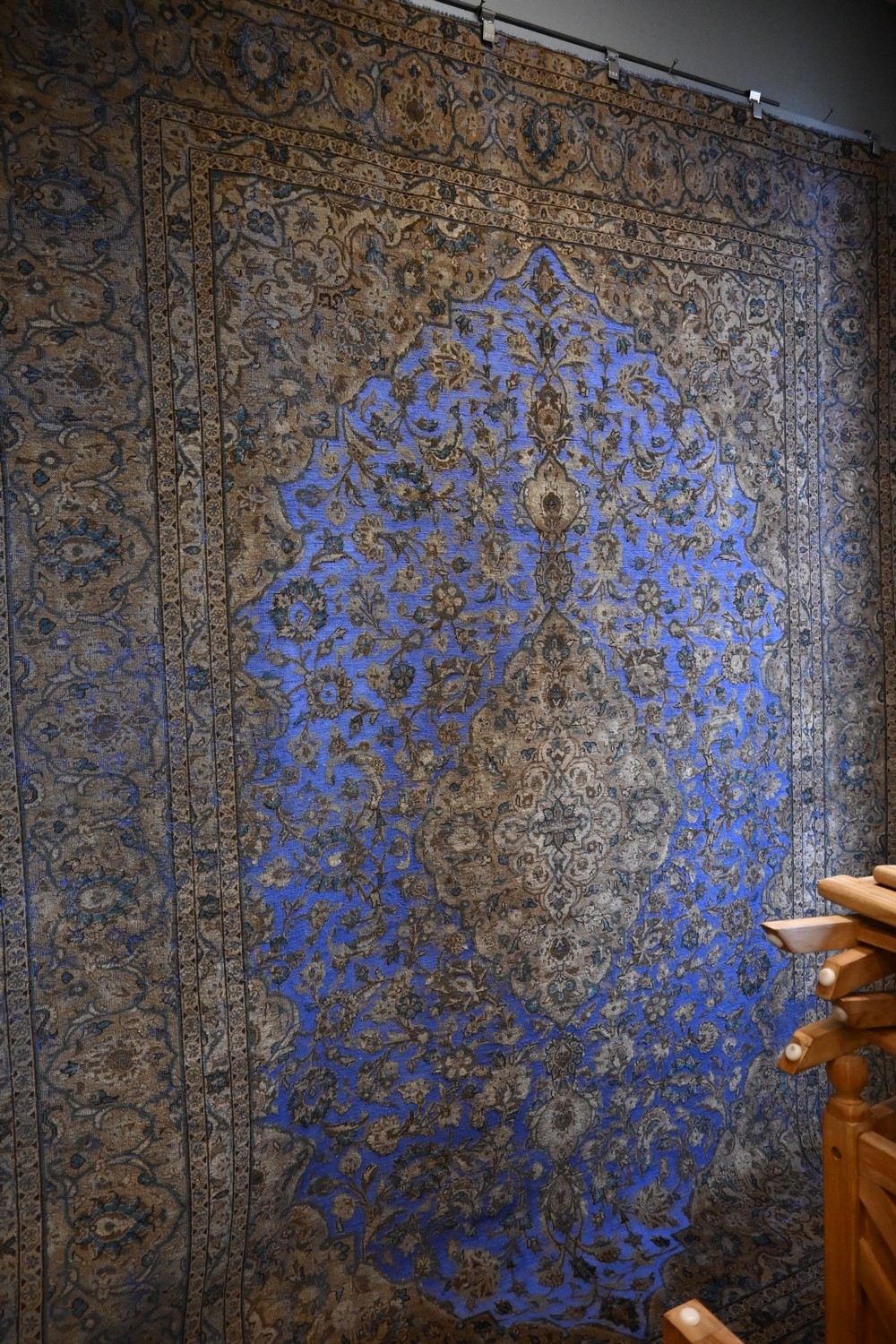 A FABULOUS MODERN VINTAGE OVER-DYED PERSIAN KASHAN CARPET, VINTAGE PILE. A UNIQUE MODERN CARPET CREATED FROM AN AUTHENTIC VINTAGE PERSIAN MEDALLION DESIGN KASHAN CARPET WITH ALL OVER SHA ABBASI PALMETTES AND FLORAL TENDRILS. THE BORDER HAS ALL OVER PALMETTES, WITH THE PILE SHORN AND OVER-DYED IN VIOLET, BROWN & TEAL DYES. GALLERY EXHIBITED. SIZE: 394 X 277CM ORIGIN: PERSIA - RRP: $8,500